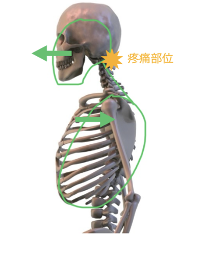下図は、頭頸部アライメント異常に伴う疼痛発生メカニズムの一例を示しています。具体的には、頭部の前方偏位および上位胸郭の後方偏位(胸郭可動域の制限を伴う場合)が確認されると、後頭下筋群や頭半棘筋、頭板状筋部に疼痛が生じやすくなります。発症要因としては、上位胸郭の後方偏位と可動性低下に起因する姿勢異常により、前方へ偏位した頭部を支持する筋群および上位頸椎に過剰な負荷が加わることが考えられます。このようなアライメント不良と局所筋群の過緊張の相互作用が、頸部から後頭部にかけての疼痛発生に寄与すると考えられます。
