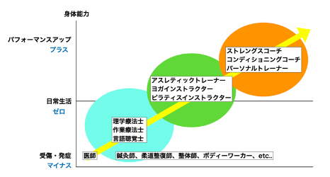 ファシアトレーニングは、一律の方法で全ての人に適用するものではなく、患者さんや対象者が置かれている段階や状況に応じて柔軟に方法を変えていくことが重要です。例えば、受傷直後や発症直後といったマイナスの段階では、医師の診断や治療を基盤とし、理学療法士や作業療法士、言語聴覚士などのリハビリ専門職が中心となって、痛みの軽減や機能回復を優先した介入が求められます。一方、日常生活を問題なく送れるゼロの段階では、鍼灸師や柔道整復師、整体師、ボディワーカーらが身体の調整を行い、姿勢や動作の質を高める関わりが有効となります。さらに、プラスの段階に進み、パフォーマンス向上を目指す人々に対しては、アスレティックトレーナー、ヨガやピラティスの指導者、ストレングスコーチやパーソナルトレーナーが、運動機能や身体能力を引き出す支援を行います。すなわち、ファシアトレーニングは多職種が連携しつつ、段階に応じた役割分担のもとで多様な方法をとりうる点にこそ、その可能性があるといえます。